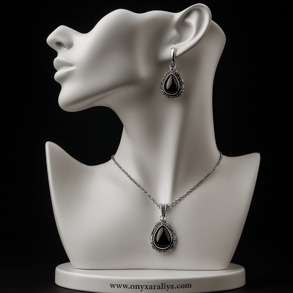Black Onyx Vintage Teardrop Pendant & Earrings Set — 925 Silver
