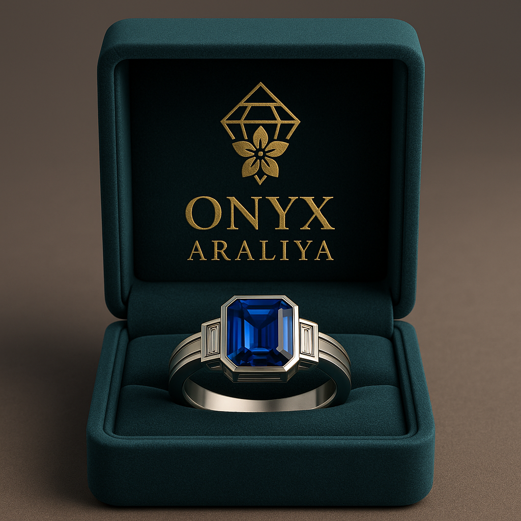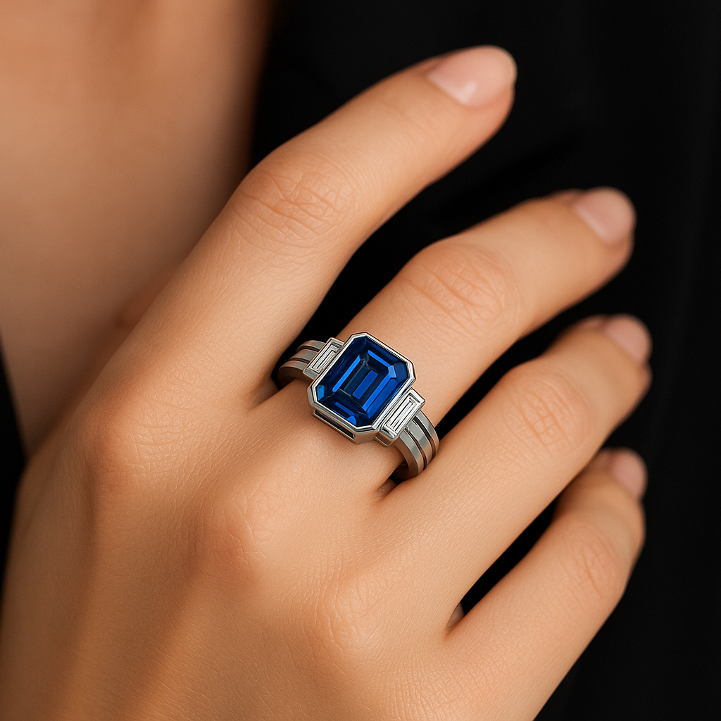 A crisp Art-Deco inspired ring crafted in Silver 925. The centerpiece is an emerald-cut Blue Sapphire seated in a geometric bezel with an open gallery for extra light. On each shoulder, tapered baguette accents (CZ by default; natural/lab stones on request) create clean, stepped lines. A slim, comfort-fit band with twin grooves completes the modern, refined profile.
