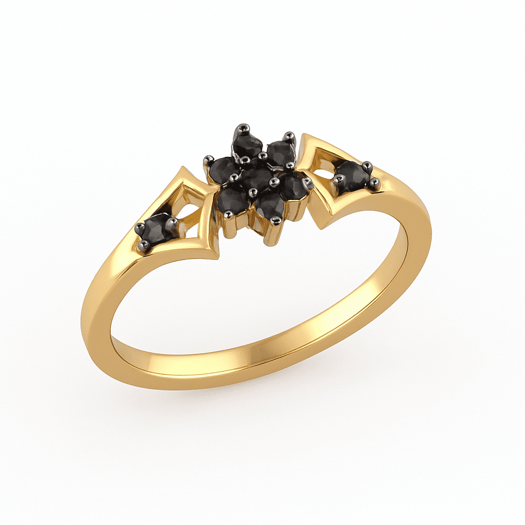 Delicate floral ring featuring a six-stone black onyx cluster with pointed, lattice-cut shoulders for a sleek, modern look.