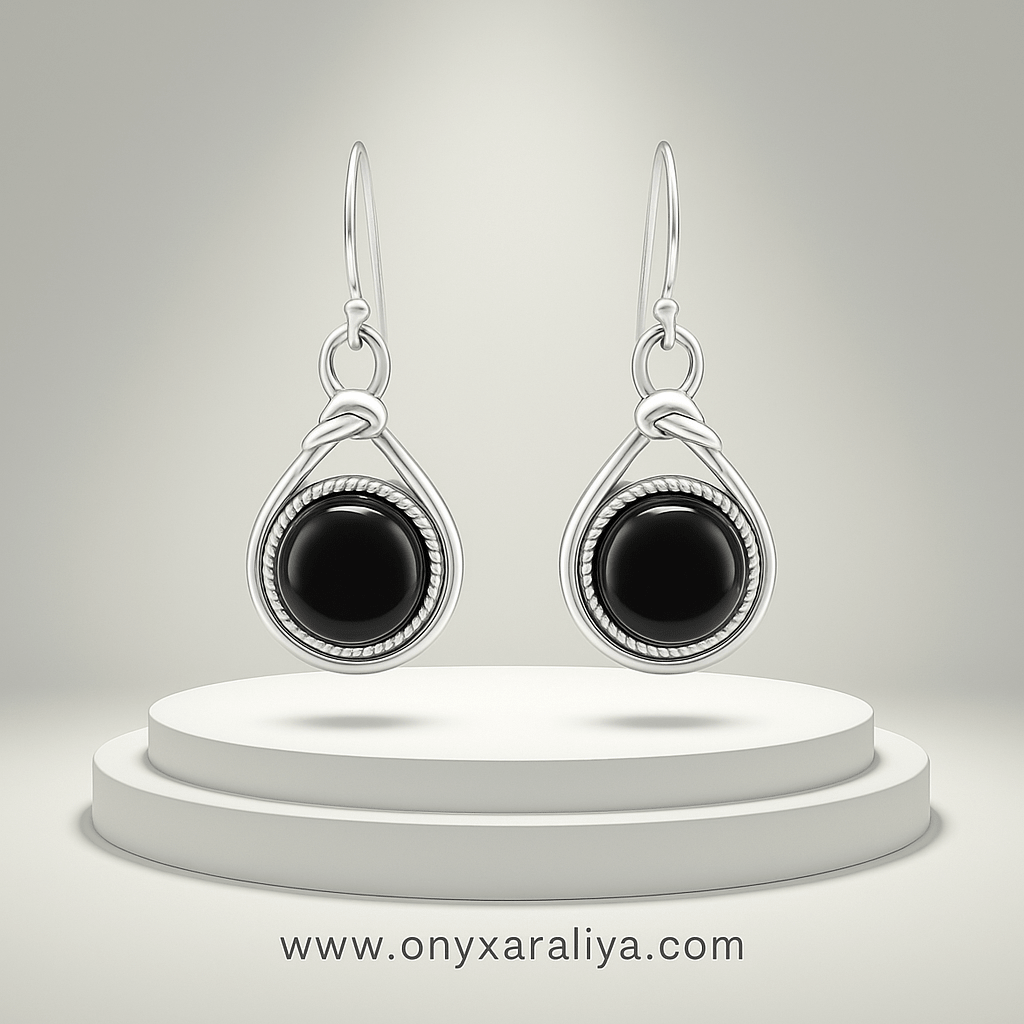 A refined and timeless design crafted with smooth polished Black Onyx cabochons set inside a sculpted silver loop frame.