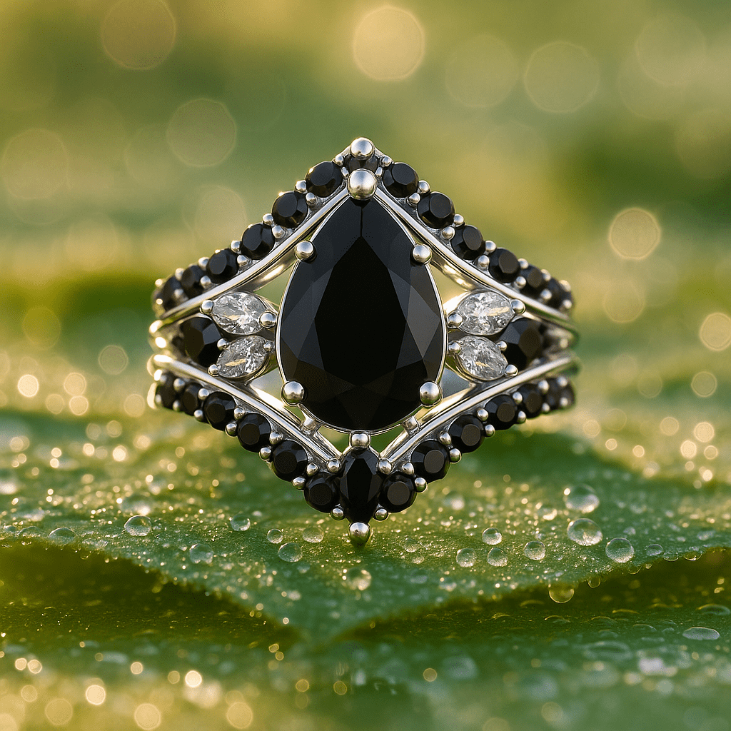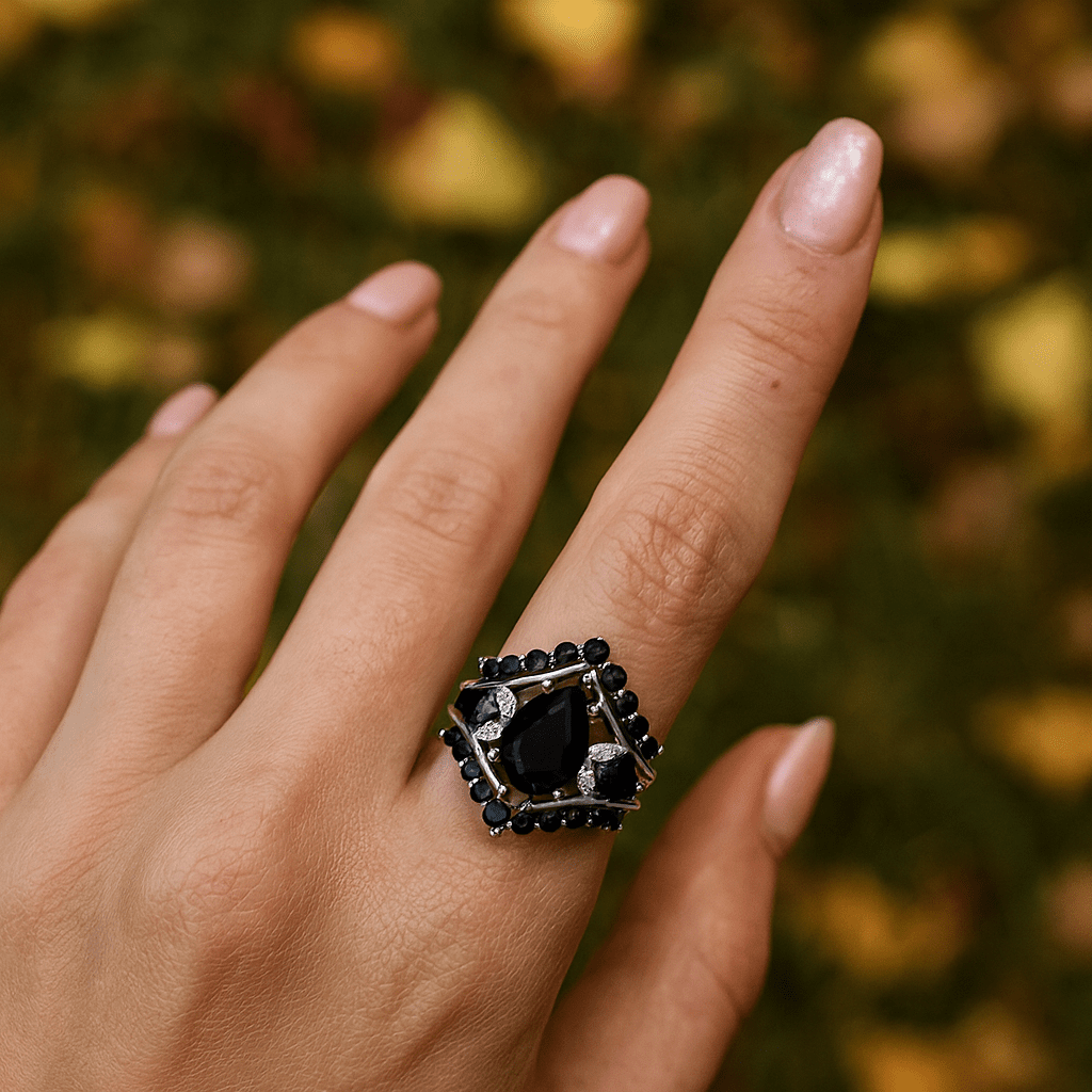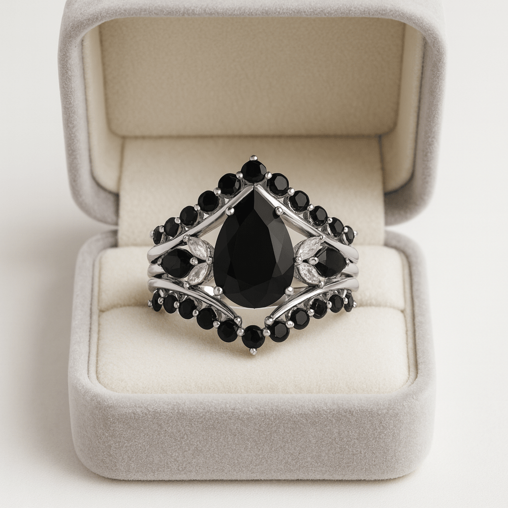 A statement cocktail/bridal piece built around a bold pear-cut Black Onyx center. Twin tiara bands are pavé-set with round Black Onyx accents, while the shoulders feature marquise white cubic zirconia “leaf” clusters for sparkle and contrast. Crafted in polished Sterling Silver 925, this layered silhouette sits securely with a comfortable, balanced profile.