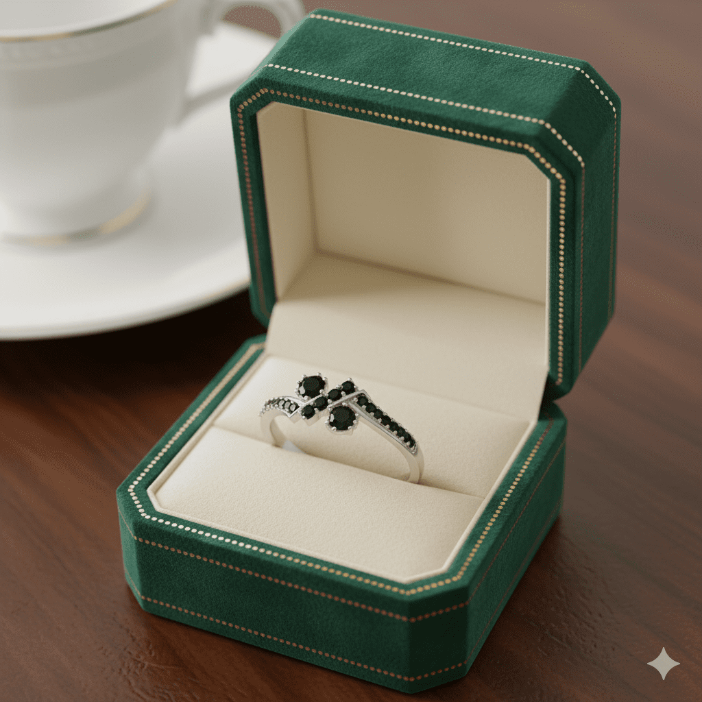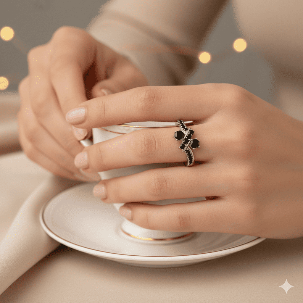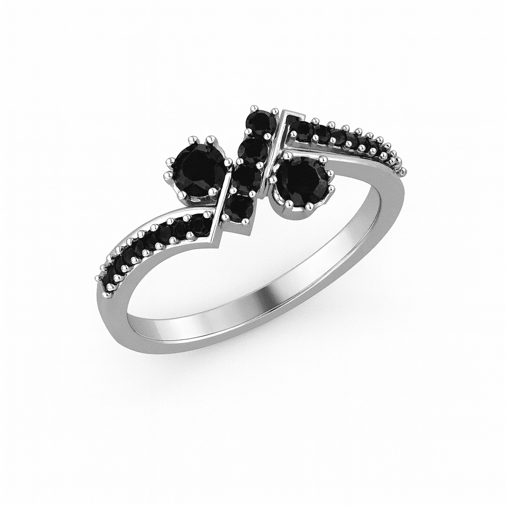 A modern split-shank band with a sharp crossover bar and two prong-set rounds, all accented by a micro-pavé Black Onyx trail. Bold contrast, low-profile comfort—made for everyday wear or stacking.