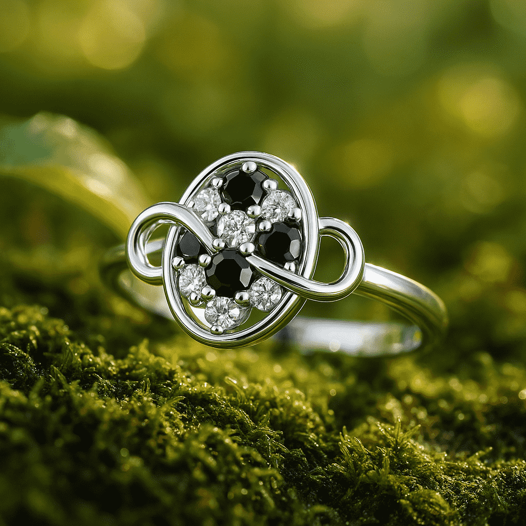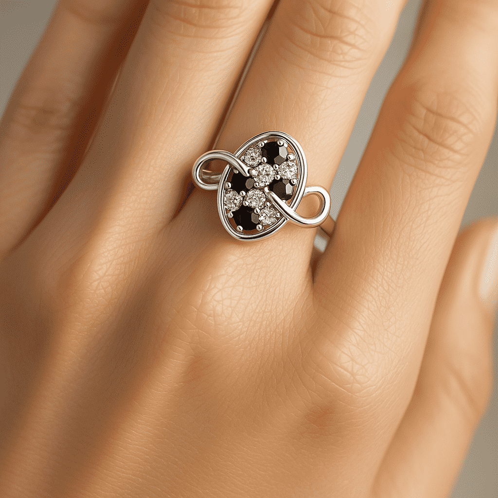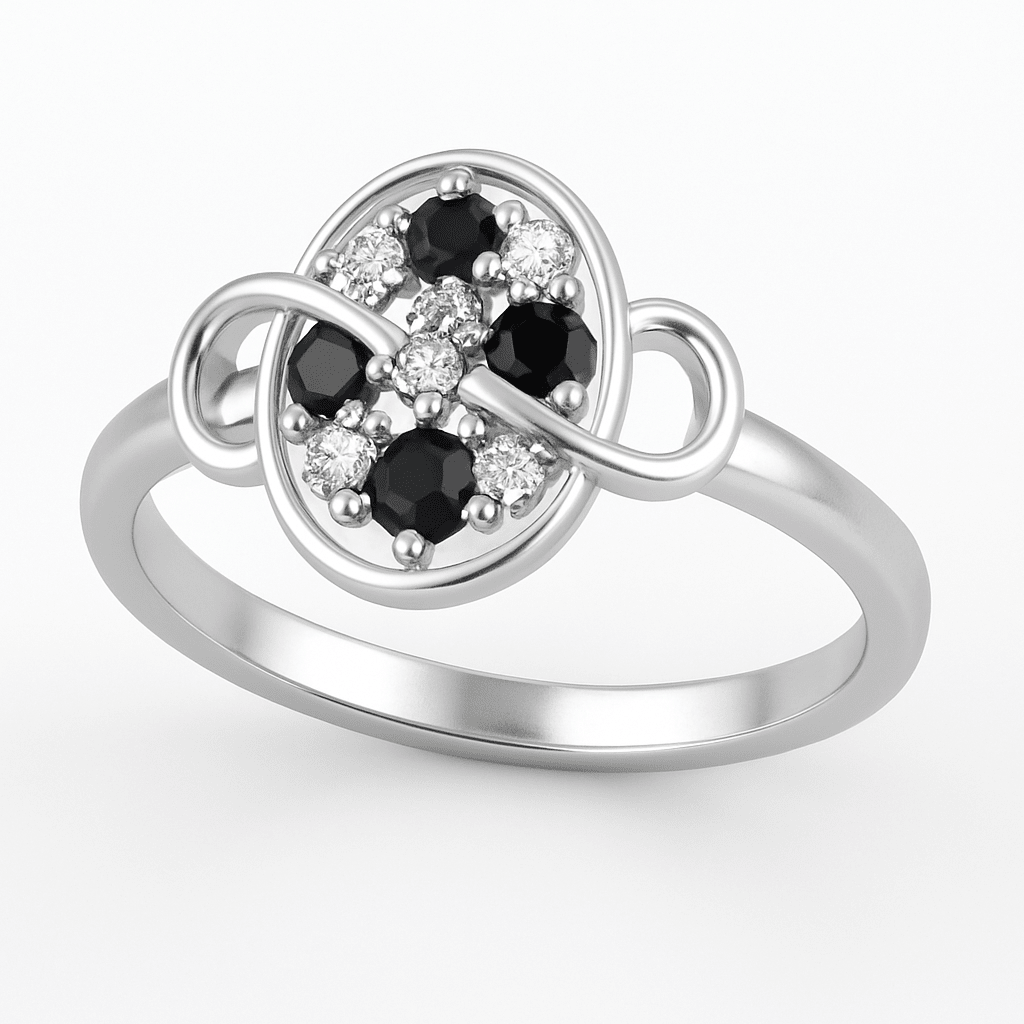 A sleek sterling-silver ring featuring an oval cluster of Black Onyx and white cubic zirconia, wrapped with a graceful infinity ribbon across the top. Petite, sparkly, and perfect for everyday elegance.