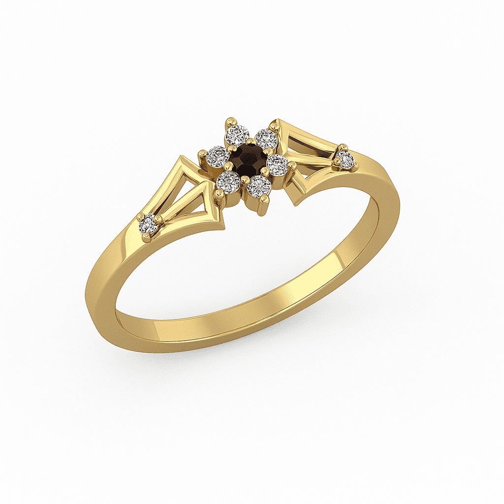 Vintage-inspired ring featuring a round black onyx center framed by a bright white cubic zirconia cluster. Geometric split shoulders add a graceful, art-deco touch.