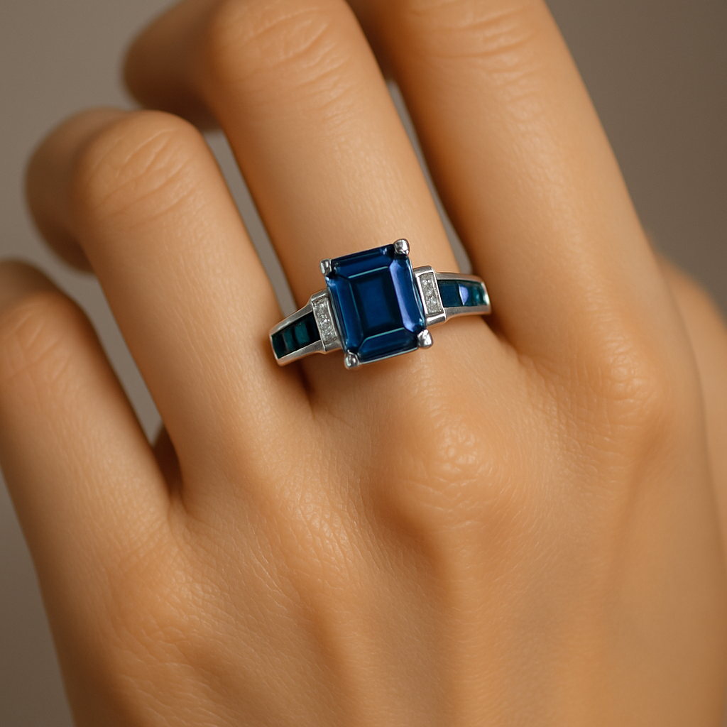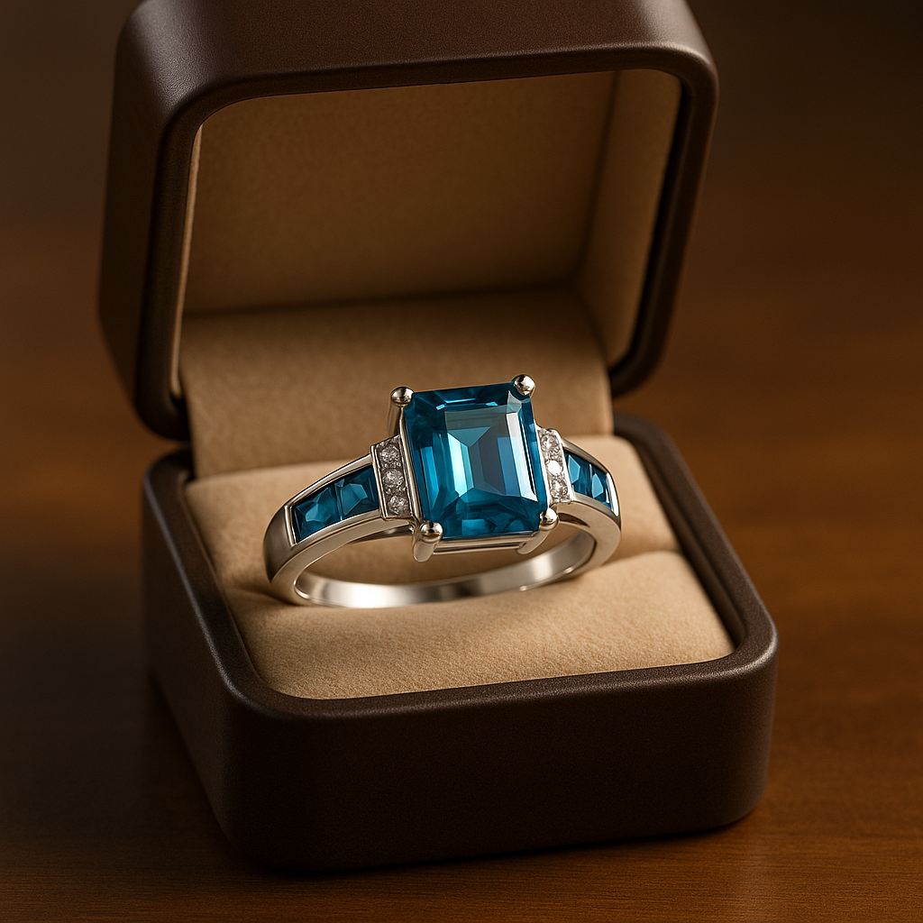 • Center: Emerald-cut blue stone (Blue Topaz / Aquamarine / Blue Sapphire / premium CZ options)