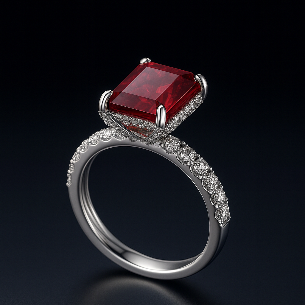 A sleek modern solitaire showcasing an emerald-cut red centerpiece held by sculpted double claws on a luminous Silver 925 setting. The gallery and basket are finished with micro-pavé detailing, while the slim band sparkles with a line of round pavé stones for a refined, high-polish look. Elegant for proposals, anniversaries, or luxe everyday wear.