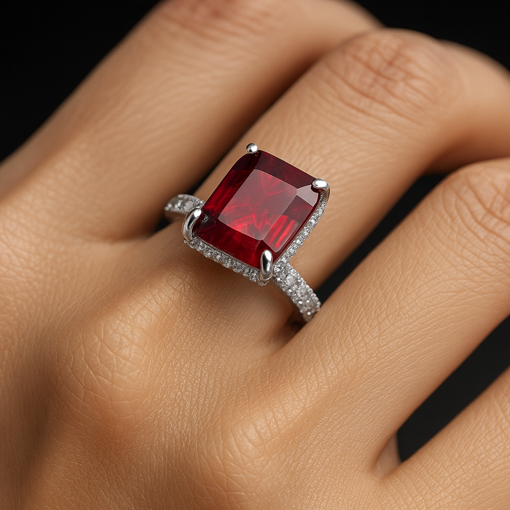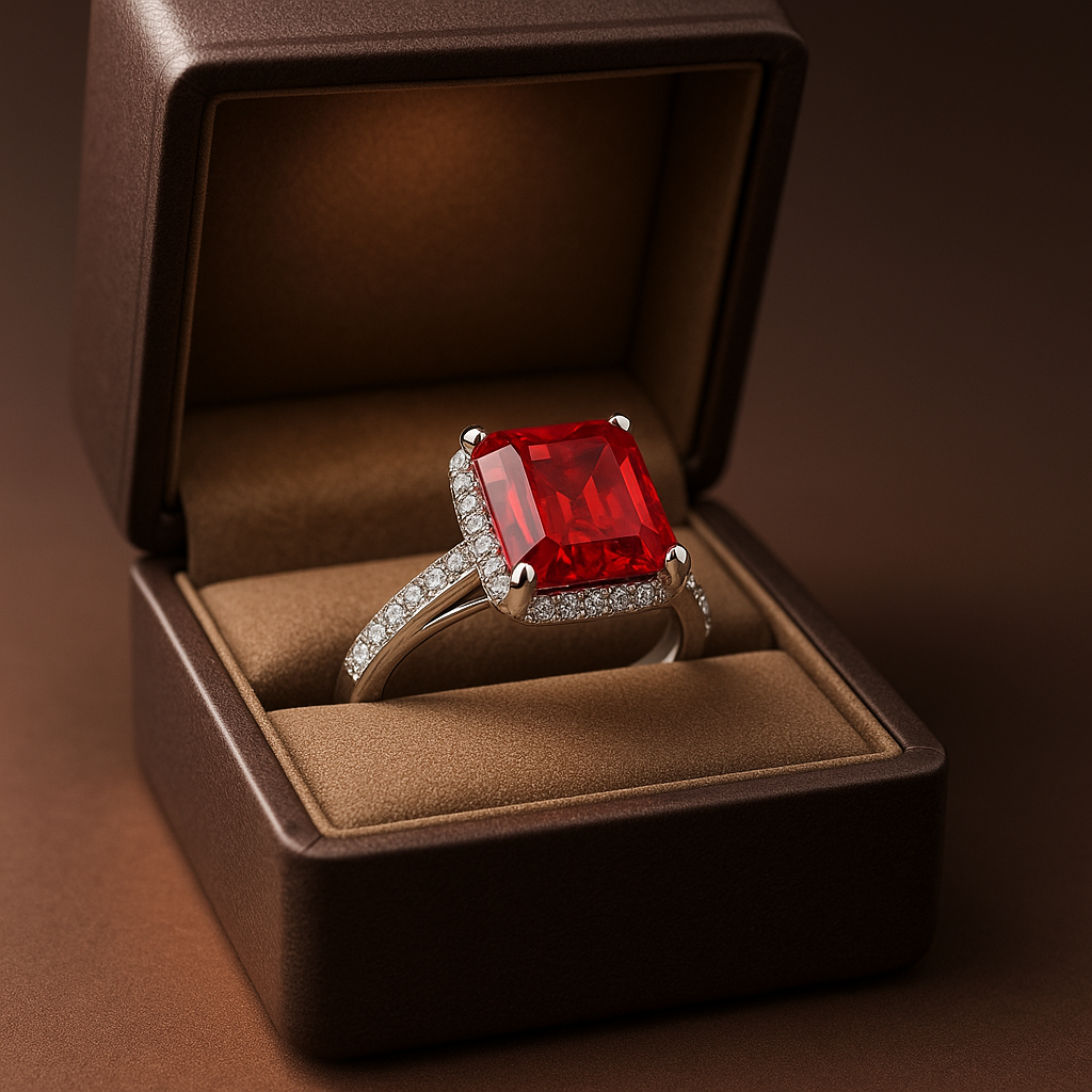 • Center stone: emerald-cut red gem (Ruby/Red Spinel/Red Topaz/Premium CZ options)