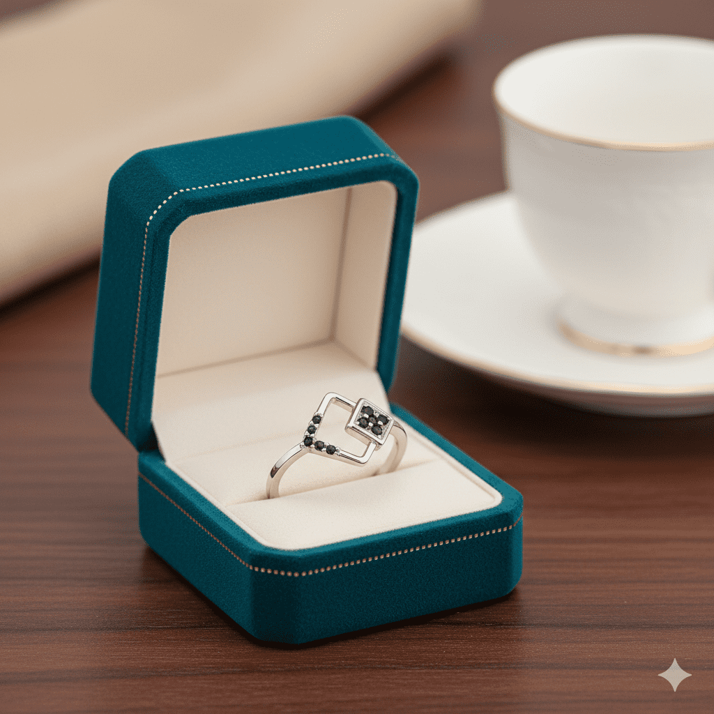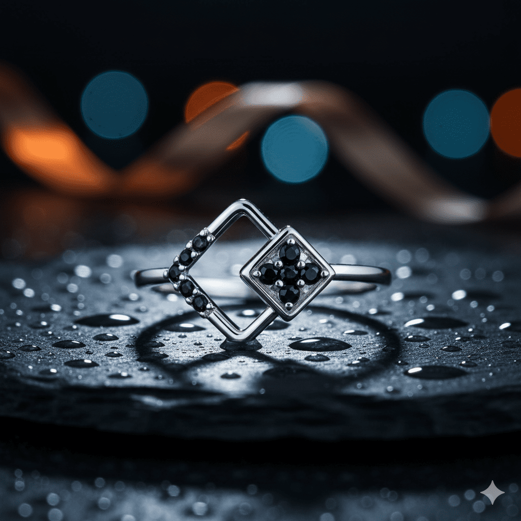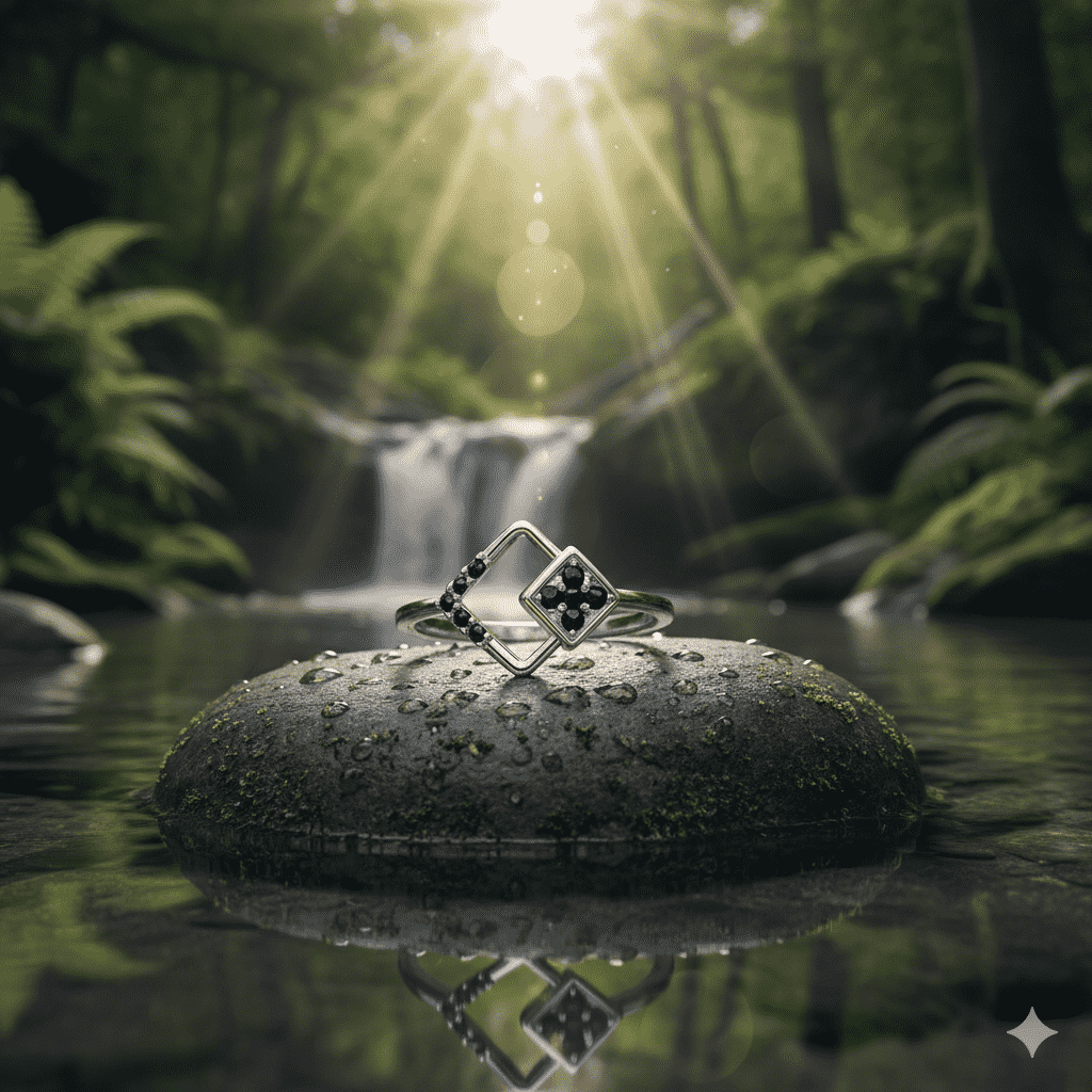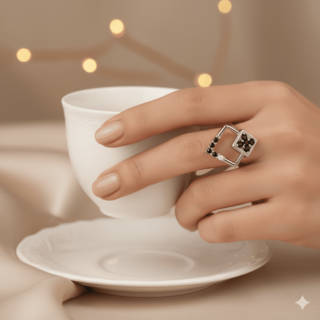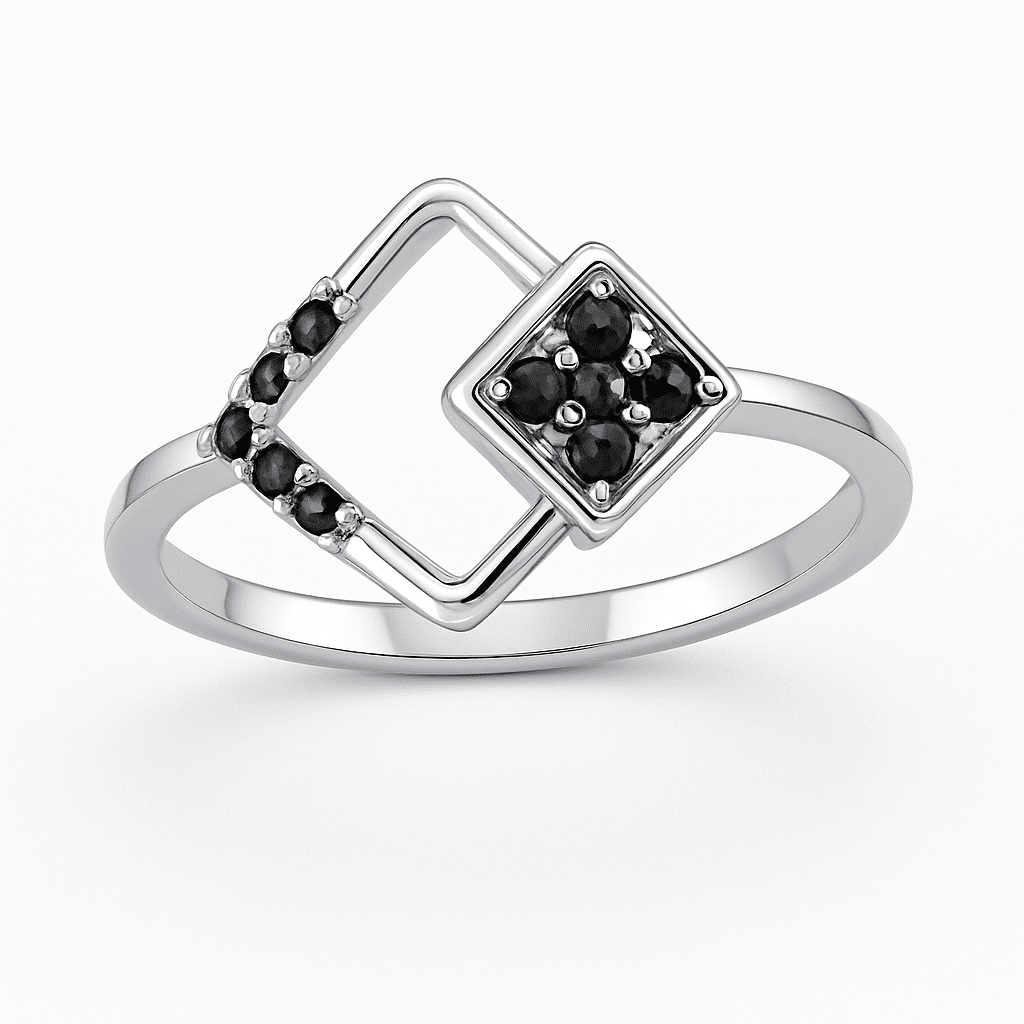 Modern open-square design featuring micro-set Black Onyx accents and a raised pavé square focal. Sleek, minimal, and perfect for everyday wear or stacking.
