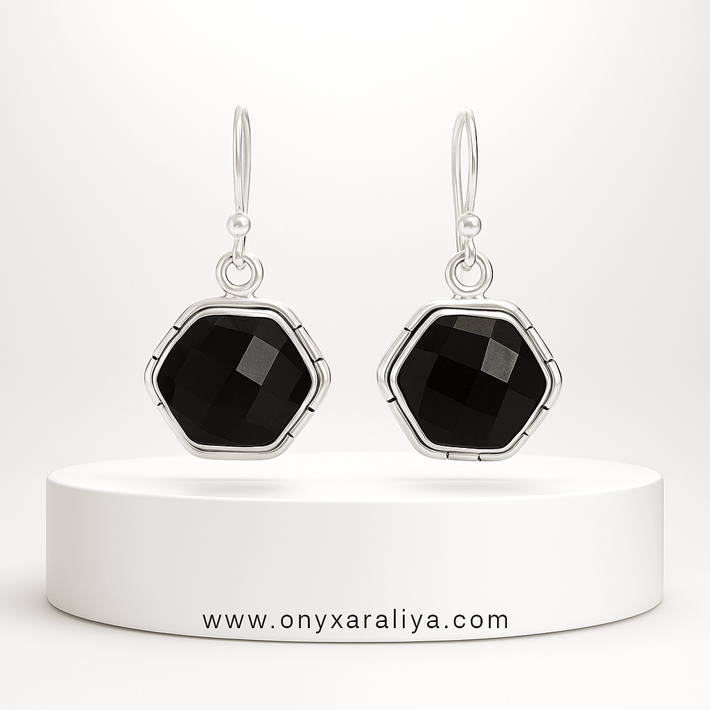 Hex-Cushion Faceted Onyx Bezel Drop Earrings – 925 Silver