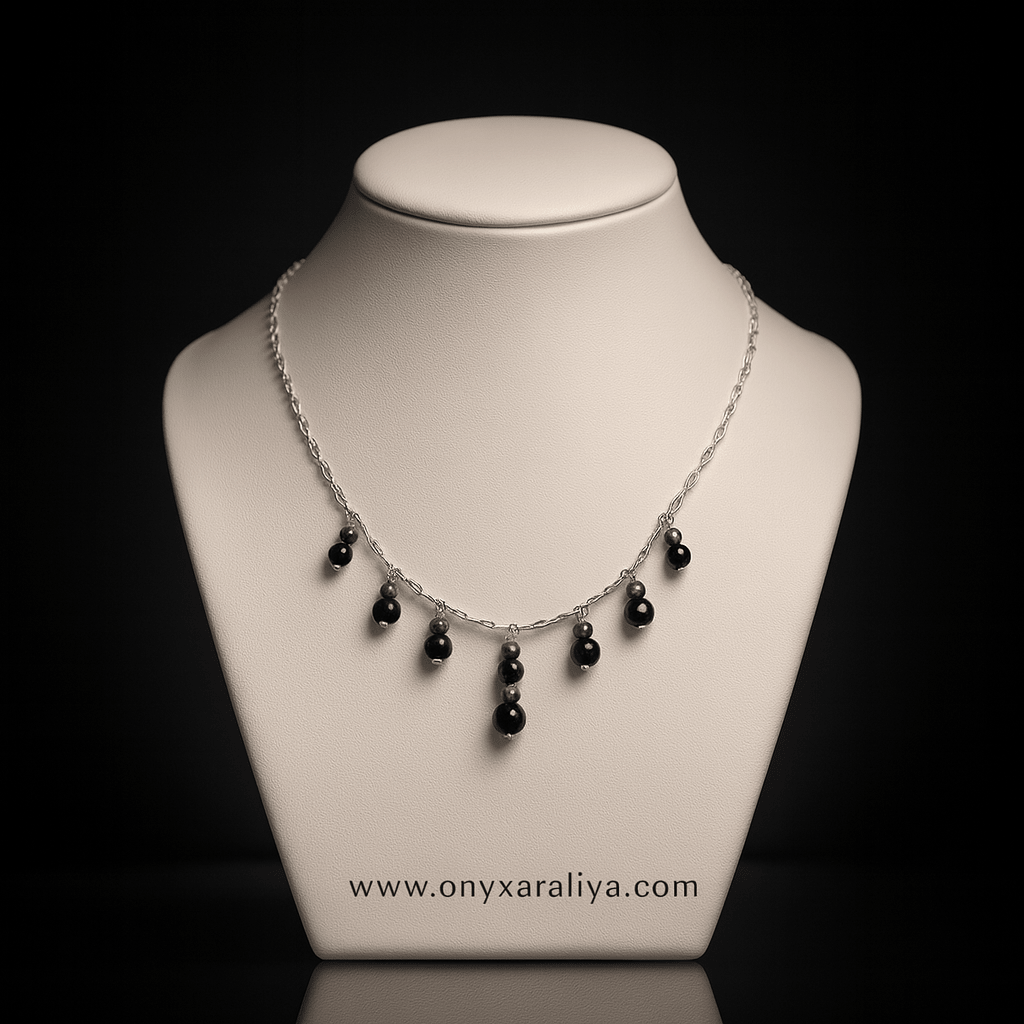 The Ebony Whisper Necklace celebrates subtle sophistication through a graceful design of natural black onyx bead drops suspended from a fine 925 sterling silver chain. Each onyx bead catches the light with a gentle sheen, adding effortless elegance to both daywear and evening looks.