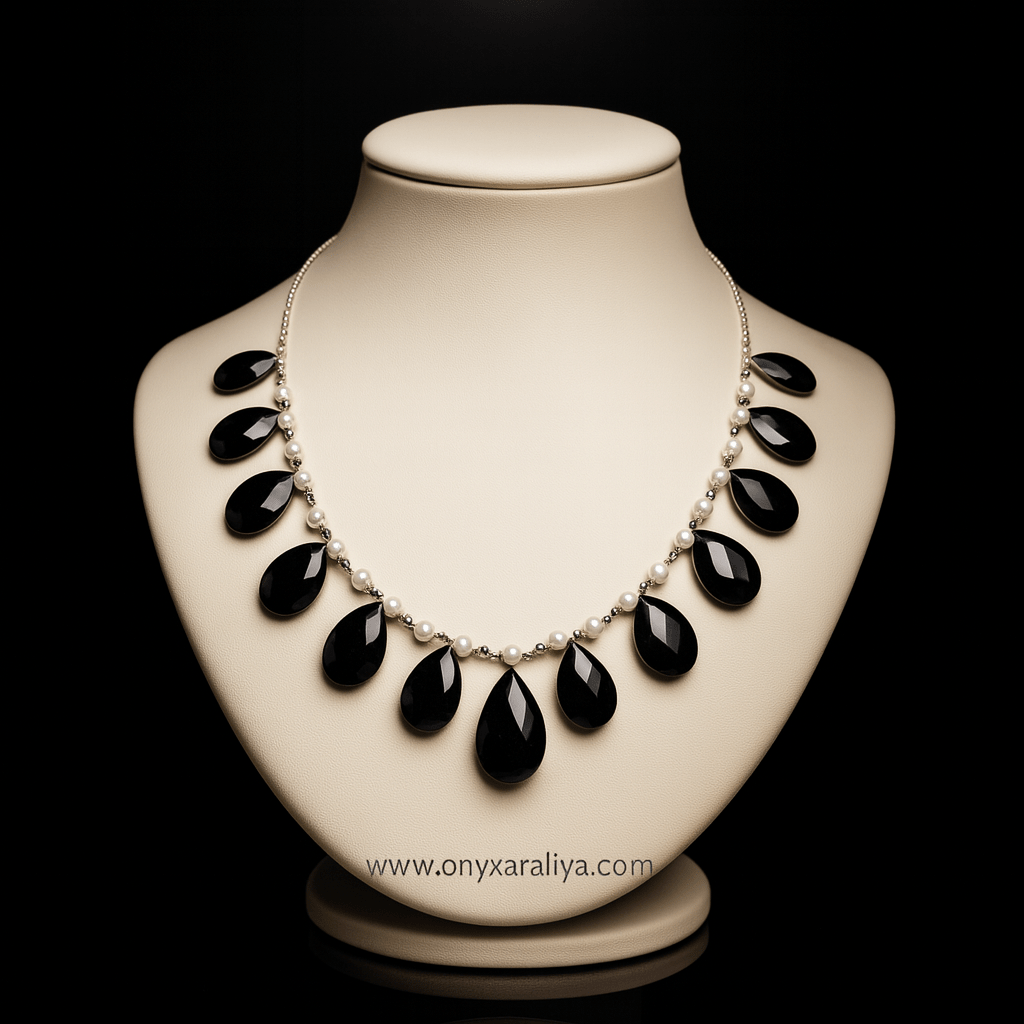 Featuring hand-polished faceted black onyx teardrops, delicately interlaced with natural freshwater pearls, this necklace speaks to those who embrace both strength and grace.