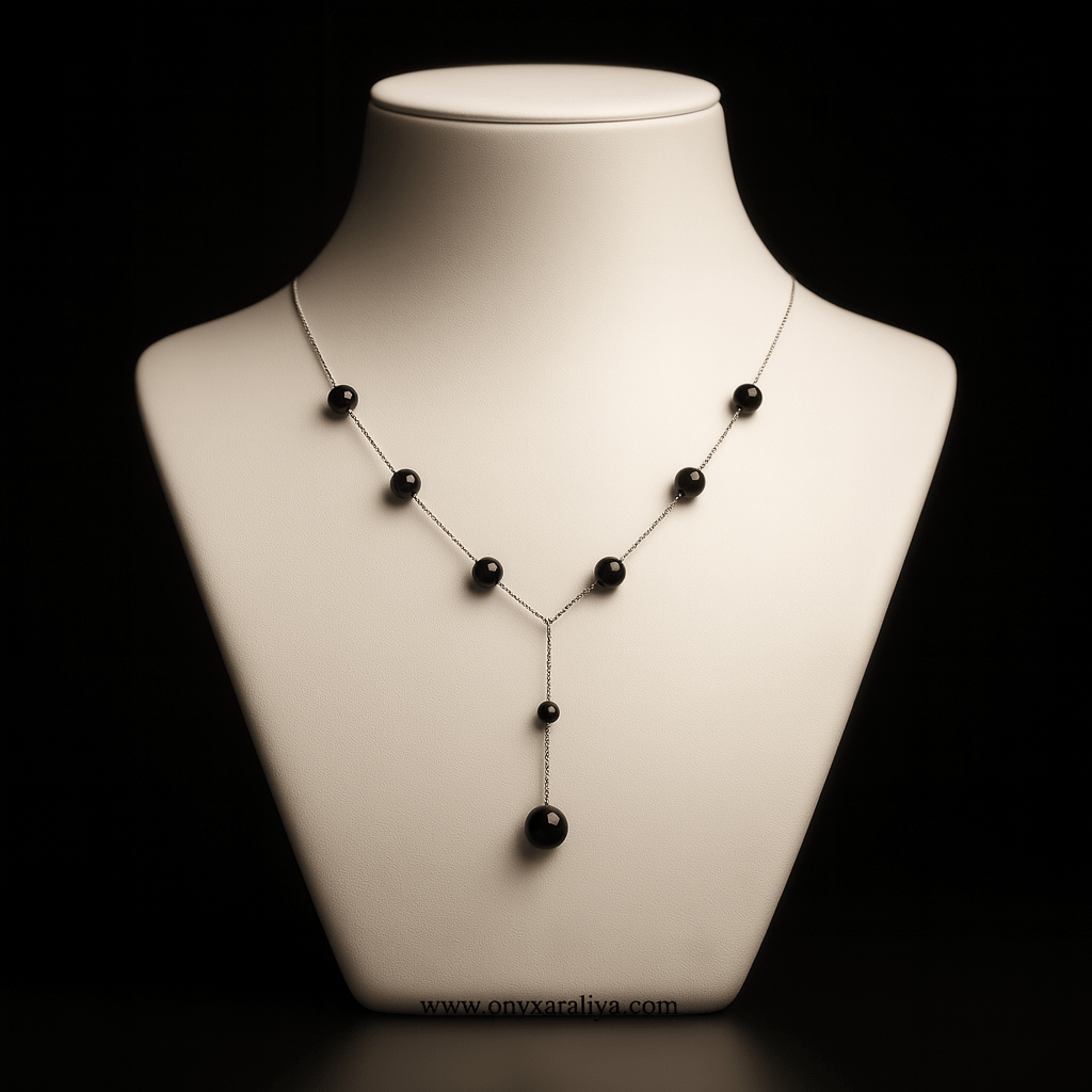 The Midnight Drop Necklace is a statement of graceful minimalism and modern charm. Crafted with perfectly polished natural black onyx beads suspended along a delicate 925 sterling silver chain, it draws the eye with a sleek Y-shaped drop that elongates the neckline with elegance.