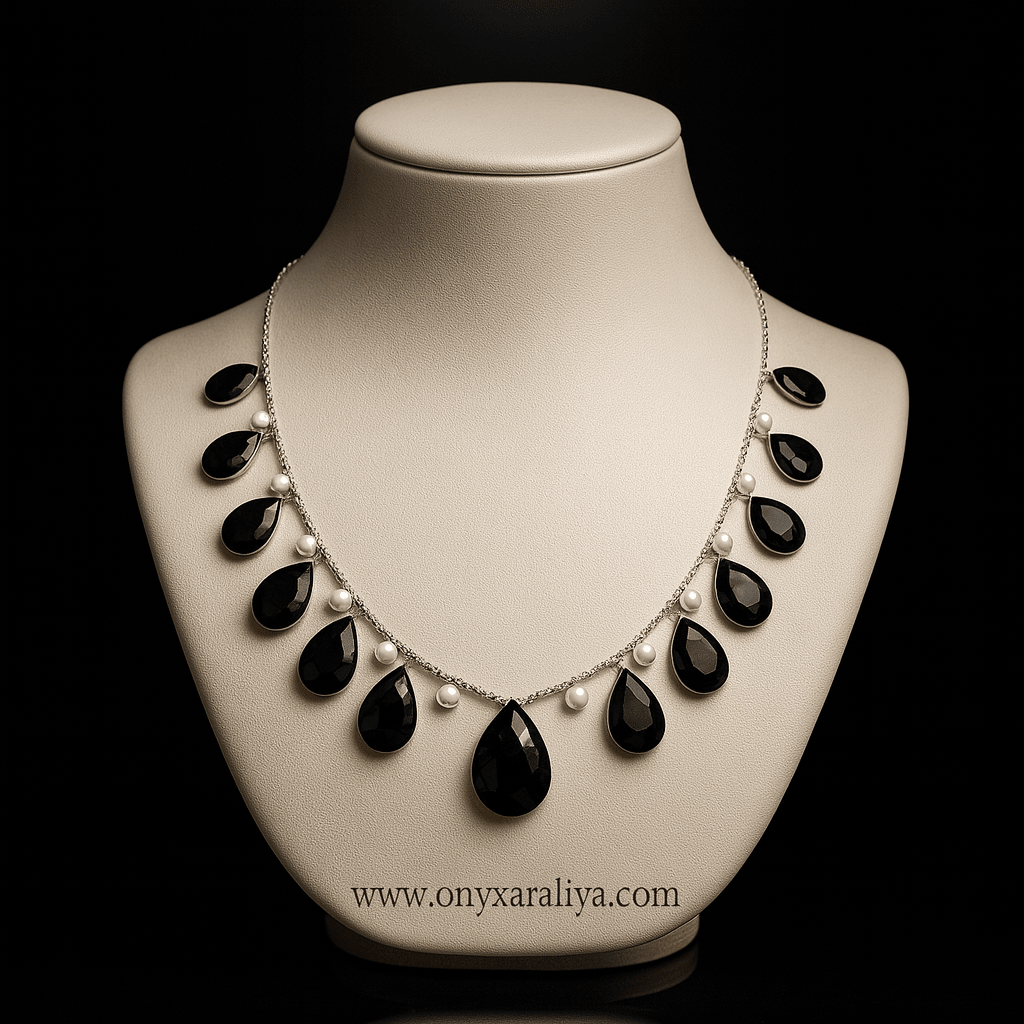 The Midnight Pearl Necklace is a captivating fusion of mystery and elegance. Featuring hand-cut faceted black onyx teardrops paired with natural white pearls, this design celebrates duality — the balance of shadow and light, strength and softness.