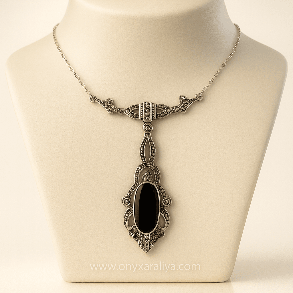 This masterfully crafted piece features a hand-cut oval black onyx encased within ornate antique silver filigree, detailed with marcasite accents that shimmer with timeless allure.