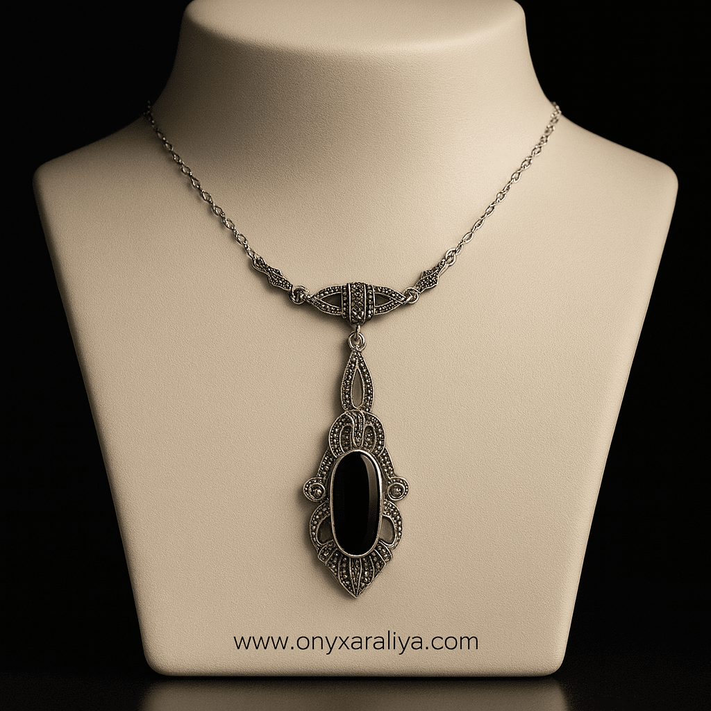 At its heart lies a natural black onyx cabochon, framed by intricate silver filigree and marcasite accents that capture the allure of vintage glamour.