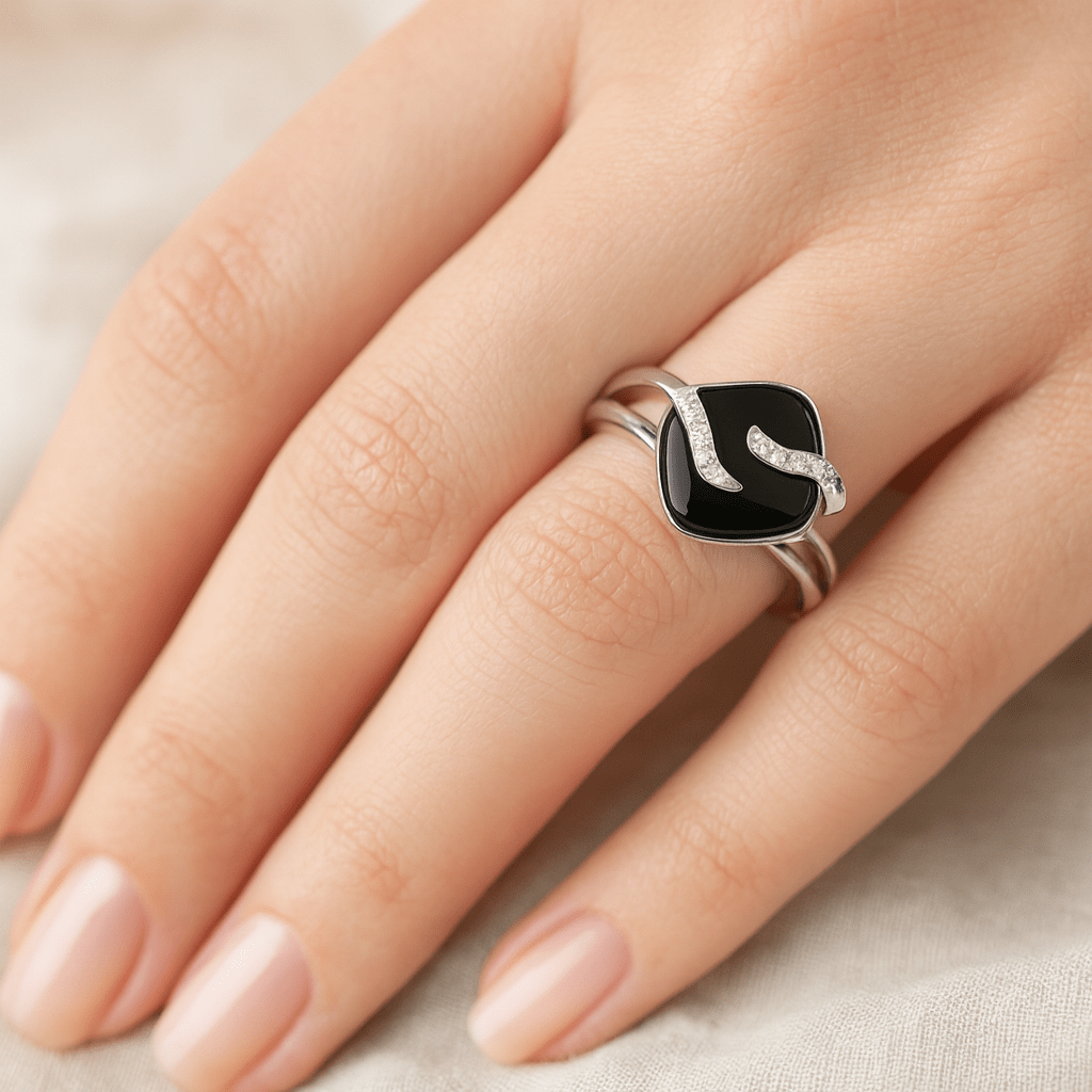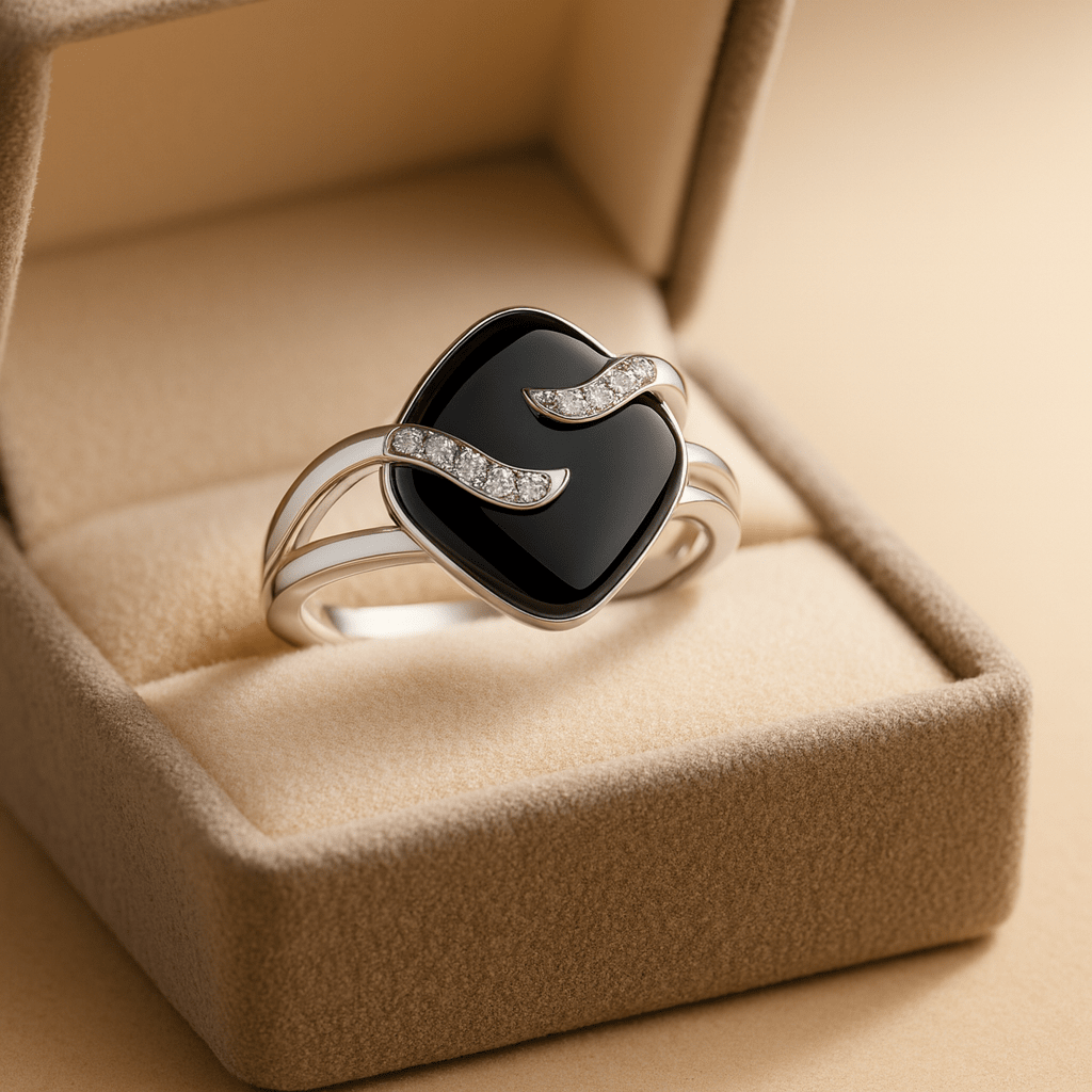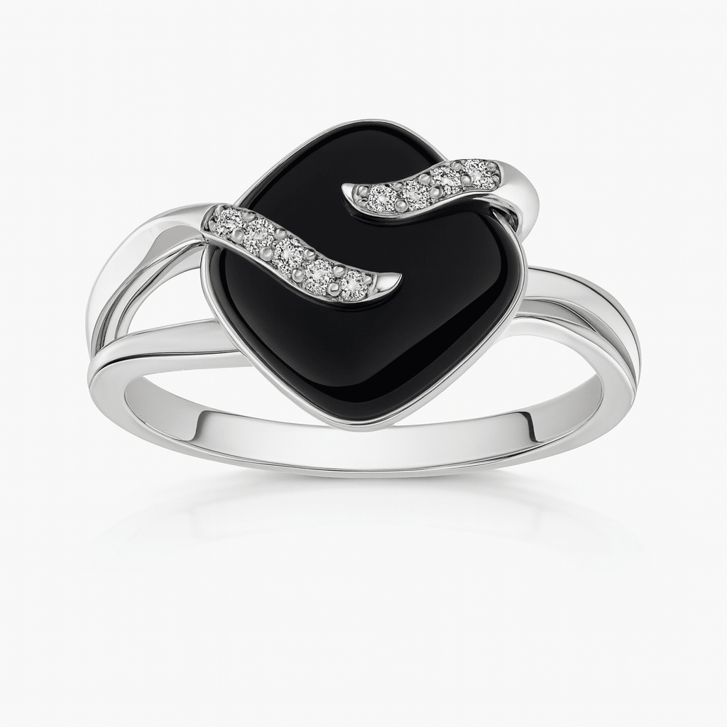 The polished black onyx cushion serves as a perfect canvas for two diamond-paved silver waves that flow gracefully across its surface, symbolizing balance and movement.