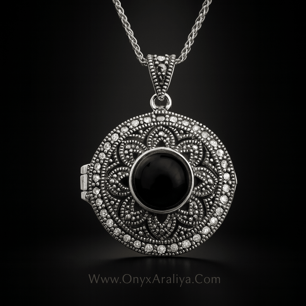 The Eternal Mandala Locket is a masterpiece of vintage artistry and symbolic elegance. At its heart rests a perfectly polished midnight-black onyx cabochon, surrounded by layers of ornate mandala-inspired metalwork. Each petal-like motif is meticulously detailed with raised granulation and shimmering white stones, creating a radiant halo effect that feels sacred, timeless, and powerful.