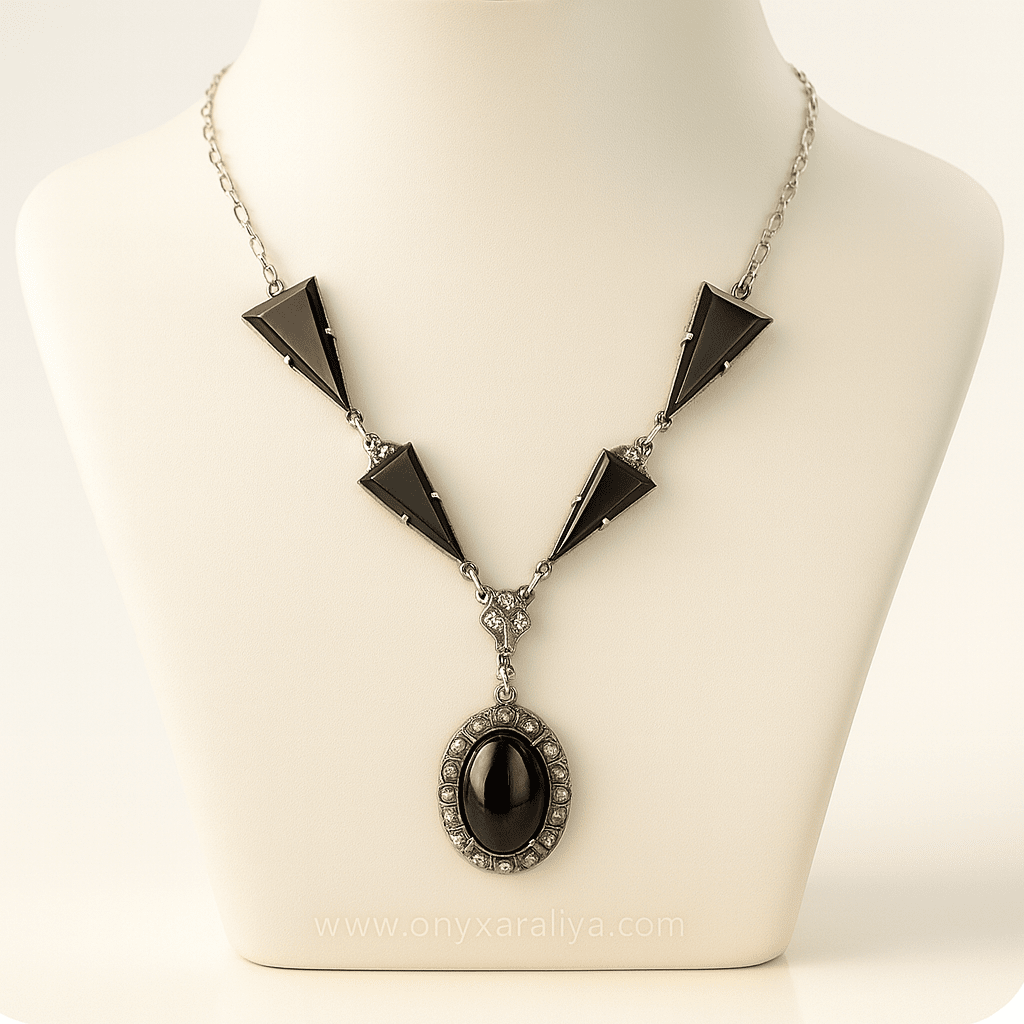 Four commanding triangular onyx stones rise in perfect symmetry, converging into a luminous oval pendant embraced by white CZ halos and intricate silver detailing.