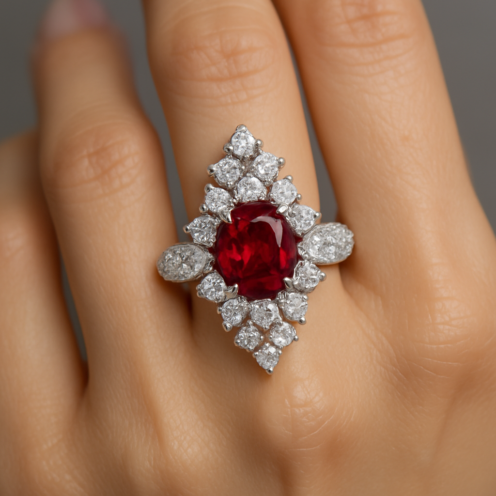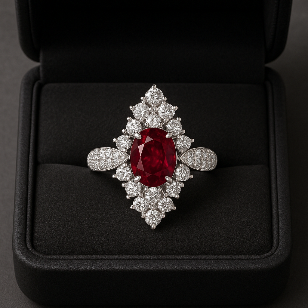 Regal cluster ring in Silver 925 with an oval ruby-red center, cascading white accents, and pavé almond shoulders—customizable stones and finish; free worldwide delivery.