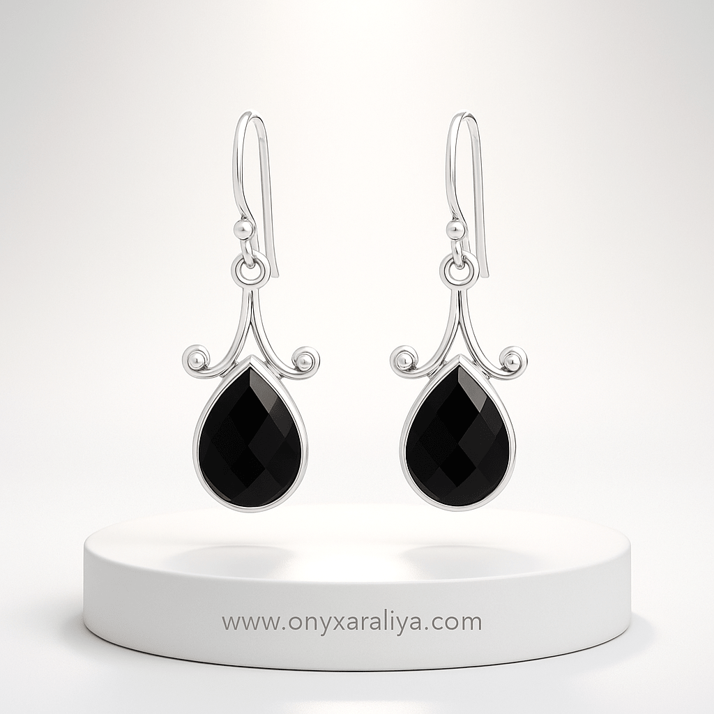 Pear-Shape Faceted Onyx Dangle Earrings – 925 Silver