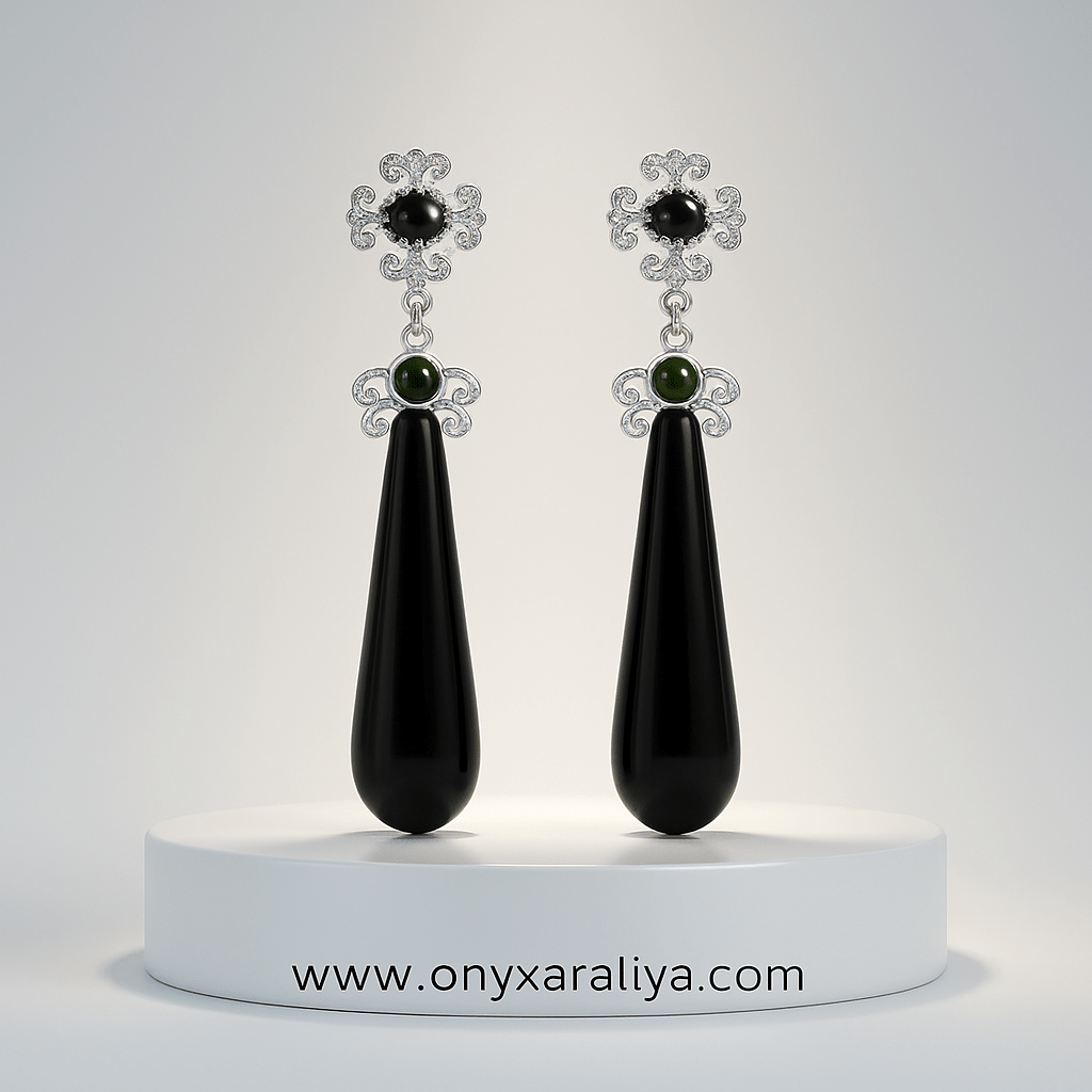 Signature Dual-Stone Long Drop Earrings – Black Onyx & Green Gemstone